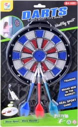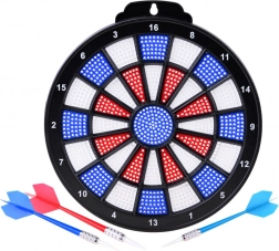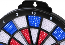 A dart tábla rekreációs használatra készült, piros, kék és fehér szegmensekkel a pontos célzás és pontozás érdekében.