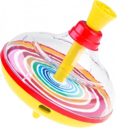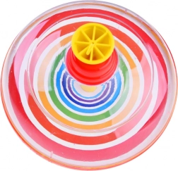 Ez az időtálló forgójáték generációkon át örömet szerez. Néhányszor nyomja le a felső dugattyút, és a pörgettyű saját tengelye körül forogni kezd – a színes koncentrikus gyűrűk lenyűgöző szivárványos hatást keltenek, amely megbízhatóan leköti a gyerekek figyelmét. Forgás közben a pörgettyű jellegzetes hangot ad, ami fokozza a szórakozást.