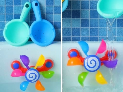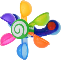 Engedje meg gyermekének, hogy élvezze a szórakozást a színes mozgó poharakkal, melyek forognak, amikor vizet öntenek rájuk, így a gyermek megtanulja a mozgás és a visszacsatolás fogalmakat. Ez a játék támogatja a motoros fejlődést, kognitív funkciókat és koordinációs képességeket. Játék közben a gyermek megtanulhatja a színeket, a számolást és elképzelheti különféle történeteket. Ez a fürdőszobai játék könnyen mozgatható és szétszerelhető, amely lehetővé teszi annak elhelyezését a kád, zuhanyzó vagy medence oldalán. A színes szivárvány poharak körbe-körbe forognak, miközben a víz csobog és serkenti a gyermek hallását.