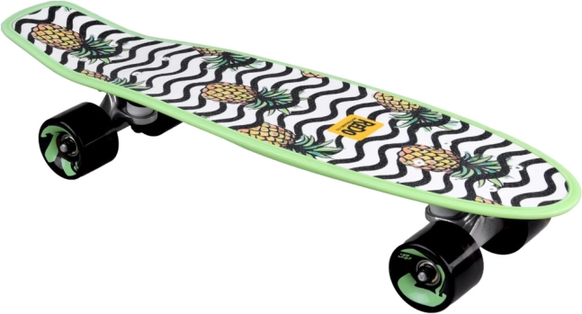 Ez a gördeszka élénk megjelenéséről ismert, ananász grafikákkal és hullámos fekete-fehér mintákkal, amely szórakoztató és figyelemfelkeltő megjelenést kölcsönöz.