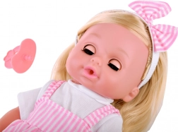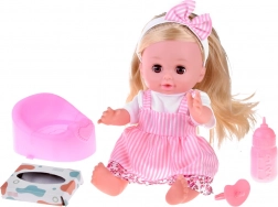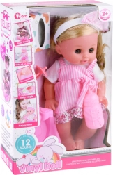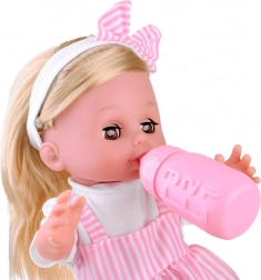A baba gyönyörű fehér és rózsaszín virágmintás ruhában és fehér pólóban van. Pisilő funkcióval van felszerelve, ami lehetővé teszi a gyerekeknek, hogy megtanulják a babaápolást. Valósághű érzést nyújt a kemény gumiból készült fej, karok és lábak által.
