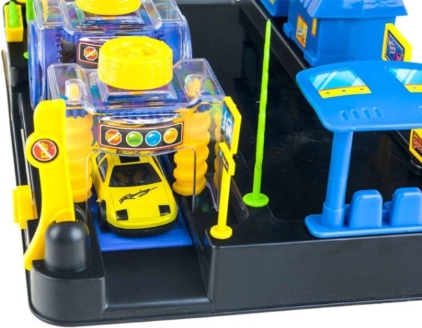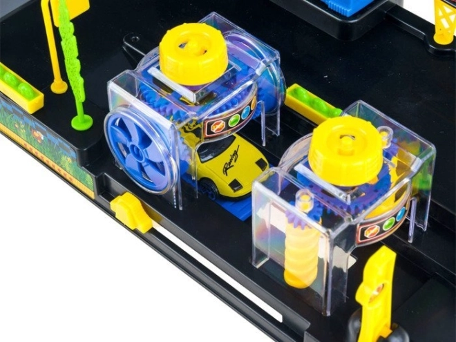 A gyerekek alaposan „le tudják mosni” járműveiket a színes mosóban kefékkel és átjáró állomásokkal – szórakozás és koordinációfejlesztés egyben.