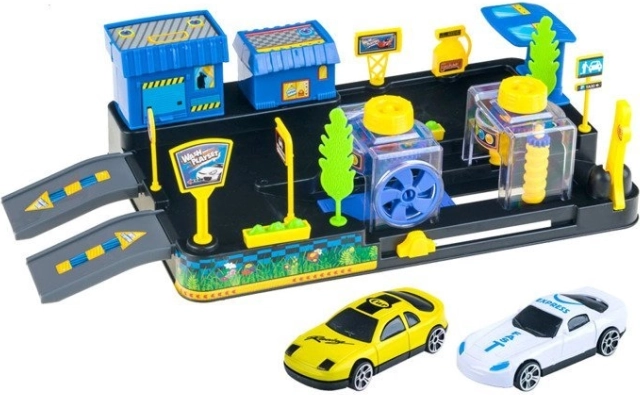 Szórakoztató készlet 3 éves kortól, amely egy teljes értékű autómosót és benzinkutat kínál gazdag tartozékokkal. Tartalmaz 2 sport kisautót (véletlenszerűen küldve), az autómosó, a kút és az épületek elemeit, matricákat és útmutatót. A forgó keféknek, rámpáknak és diagnosztikai állomásnak köszönhetően a gyerekek kreatív és valósághű játékot élhetnek át az autókkal.