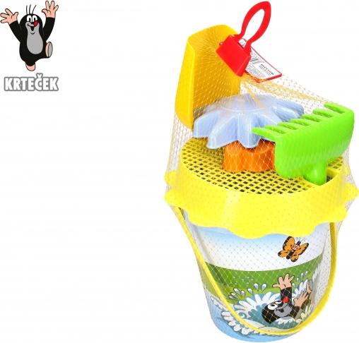 A közkedvelt VAKOND motívummal díszített gyerek homokozó készlet órákon át tartó kinti szórakozást nyújt. Tartalma: 1,5 l-es vödör, szita, lapát, gereblye és 2 forma – tökéletes várak és homoksütik építéséhez a játszótéren vagy a strandon. Ajánlott 3 éves kortól.
