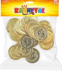 Szórakoztató készlet aranyszínű műanyag érmékből játékokhoz, versenyekhez és tematikus bulikhoz. A csomag kb. 24 darabot tartalmaz, 3,4 cm átmérővel. Ideális társasjáték-zetonként, gyerekzsúr kellékeként vagy oktatási segédeszközként számoláshoz és jutalmazáshoz.