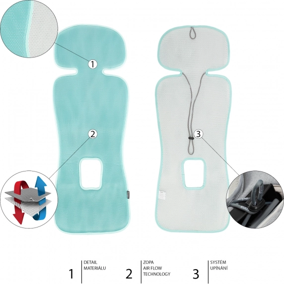 A légáteresztést az egyedülálló Zopa Air Flow technológia biztosítja: a 3D hatszögletű struktúrájú anyag lehetővé teszi a levegő áramlását a betéten keresztül, az autósülés és a gyermek között.
