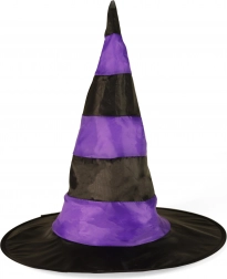 A kalap kiemelkedik ikonikus boszorkány megjelenésével, amely széles karimát és csíkos mintát tartalmaz.