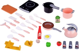 A szett mindent tartalmaz, amire egy kis szakácsnak szüksége lehet: főzőlap, edények, konyhai eszközök, sőt még élelmiszerek és fűszerek is.