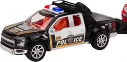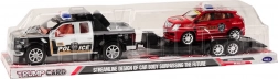 Akciódús rendőrségi készlet fekete pickuppal, szállító trélerrel és piros terepjáróval, 3 éves kortól. A lendkerekes meghajtásnak, a levehető utánfutónak és a valósághű POLICE részleteknek köszönhetően órákig tartó szórakozást nyújt. Minőségi kivitel műanyagból és fém elemekből. Tanúsítvány: CE és EN71.