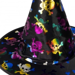 Alkoss felejthetetlen jelmezt ezzel a fekete kalappal, színes koponya mintával. Tökéletes boszorkány- és halloweeni öltözékekhez, és könnyen kombinálható köpennyel, ruhával vagy álarccal. Gyermekméretének köszönhetően remekül illeszkedik, és kiemel minden ijesztő vagy mesebeli átváltozást.