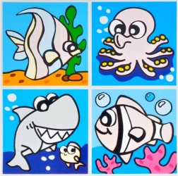 A csomag különböző motívumokat tartalmaz, beleértve állatokat és közlekedési eszközöket. Minden lap négy képet tartalmaz, amelyek tökéletesen illenek a gyerekfürdőszobába.