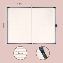 Klasszikus kék vonalas jegyzetfüzet mindennapi használatra. Ideális munkahelyi vagy iskolai jegyzeteléshez, könnyen testreszabható vállalati logó dombornyomásának lehetőségével.