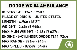 Ez a valósághű Dodges WC 54 modell építőkészlet lehetővé teszi, hogy újraalkosson egy darab történelmet hiteles részletekkel. A modell 1:35 méretarányú, és a RAM TRUCKS licencnek köszönhetően magas minőséget és pontosságot kínál. A 293 kockájával és a figurával ideális nemcsak építőknek, hanem a katonai történelem szerelmeseinek is.