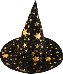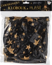 Gyermek boszorkánysapka és palást fekete–arany, 38 cm átmérő