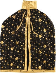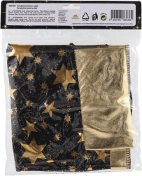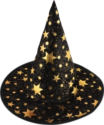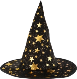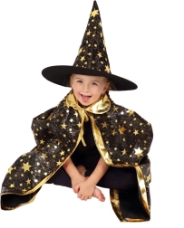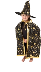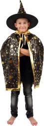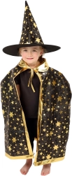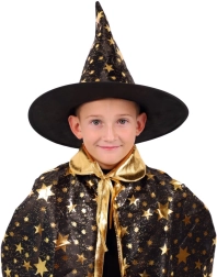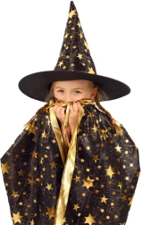 Stílusos szett kis varázslóknak és boszorkányoknak: fekete–arany boszorkánysapka és palást csillagmintával. Remek választás karneválra, Halloweenre és otthoni varázsjátékhoz. A könnyű anyag és a feltűnő dizájn gondoskodik a kényelmes viselésről és a mutatós megjelenésről minden alkalommal.