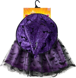 Ez a gyerek boszorkányjelmez játékos dizájnjával és kényelmes viseletével hódít. A könnyű tüllszoknya denevérmintával kb. 30 cm hosszú, és a rugalmas derékguminak köszönhetően könnyen alkalmazkodik az alkatra. A szett része egy hegyes kalap is azonos stílusban, amely teljessé teszi a varázslatos megjelenést.