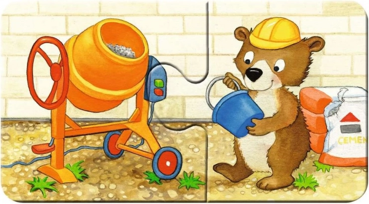 A készlet 9 önálló kirakót tartalmaz, mindegyik 2 nagy darabból áll – tökéletes kezdés az első sikerélményekhez. A bájos, építkezésen dolgozó állatokat ábrázoló illusztrációk motiválják a gyerekeket a formák és színek felfedezésére, és örömtelivé teszik a játékot.