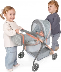 A praktikus felszereltség része a levehető táska cipzáras zárással, a mózeskosár-takaró áttetsző, cipzáras zsebbel és rögzítőfülekkel, a kényelmes matrac és a tágas kosár apróságoknak. A kerekek sima gurulást biztosítanak lakásban és kültéren is, a fém, műanyag és textil könnyű szerkezet pedig megkönnyíti a hordozást és a kezelést.