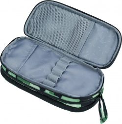 Stílusos Baagl zöld diák tolltartó három rekesszel, ideális iskolai használatra, biztonságosan és rendezetten tartja az íróeszközeidet.