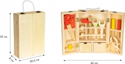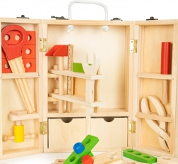 A láda speciális rekeszeket és egy kihajtható falat tartalmaz szerszámtartókkal, ami biztosítja a könnyű hozzáférést és a rendet. A sok különböző alkatrésznek köszönhetően gyermeke egyszerű szerkezeteket építhet és fejlesztheti képességeit, mint például írás, rajzolás vagy öltözködés.