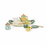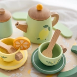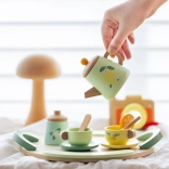 Varázslatos teázást kínálhat a gyerekeknek az elegáns, finom pasztell árnyalatú fa készlettel. A szett gyümölcs- és virágmotívumokkal díszített, és tartalmaz kancsót, csészéket csészealjakkal, kanalakat, tejes- és cukortartót, valamint nagy, füles tálcát a könnyű hordozáshoz.