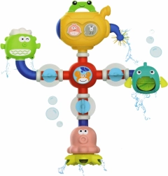 Tegye szórakoztatóvá a fürdést a gyerekeknek ezzel az interaktív fürdőjátékkal – tapadókorongos robottal. Öntsön vizet a robot fejébe, és figyelje, ahogy megforognak a lapátok, elindulnak a szökőkutak, és a három vezérlőszelepnek köszönhetően megváltozik a vízáramlás. A játék fejleszti a finommotorikát, a logikus gondolkodást és támogatja a szenzoros észlelést. Egyszerű felszerelés csempére vagy kádra a erős tapadókorongoknak köszönhetően.