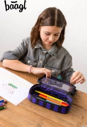 Stílusos BAAGL iskolai tolltartó WEDNESDAY motívummal, fekete–lila csíkos dizájnnal, masszív kialakítással, áttekinthető belső elrendezéssel kihajtható elválasztóval és praktikus cipzáras zsebbel. Ideális az iskolába és utazáshoz, töltet nélkül – készen áll a személyre szabásra az igényeid szerint.