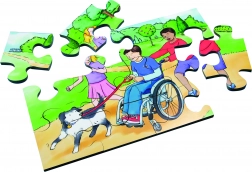 Fedezze fel a oktatási puzzle-kat 72 darabbal, amelyek jeleneteket ábrázolnak, ahol fogyatékkal élő egyének vesznek részt mindennapi tevékenységekben. Minden kép az integráció és a kölcsönös segítségnyújtás gondolatát támogatja. Ezek a puzzle-k segítenek a gyerekeknek megérteni az egyenlőséget, empátiát és tiszteletben tartani mások különbözőségeit.