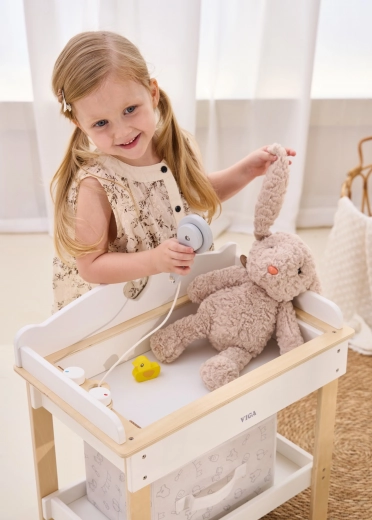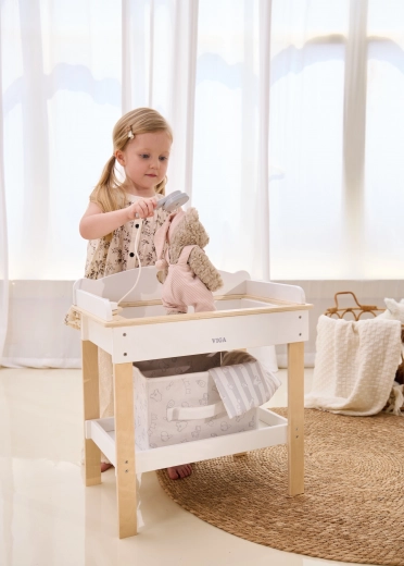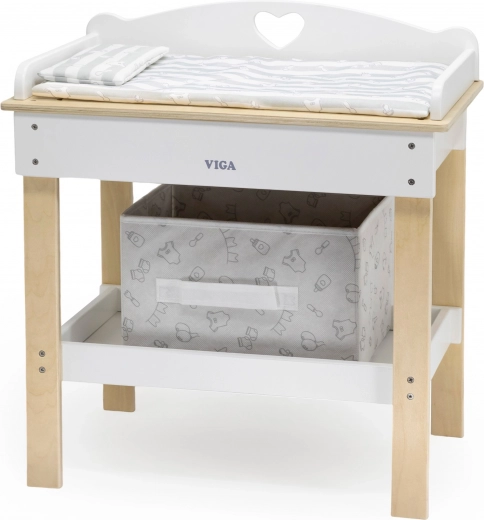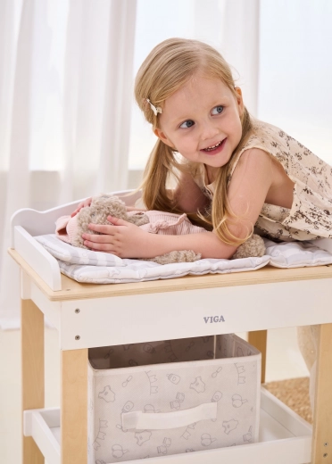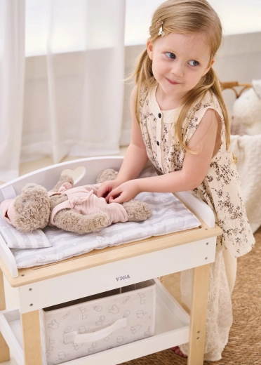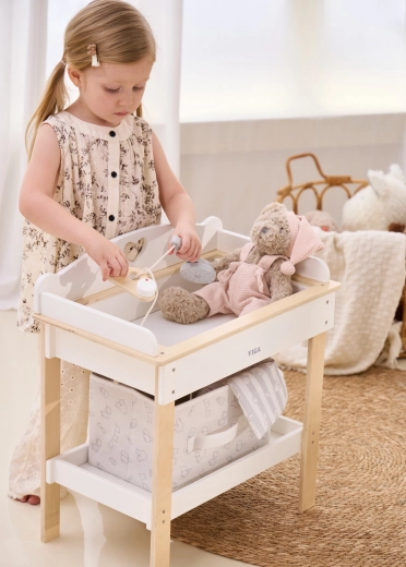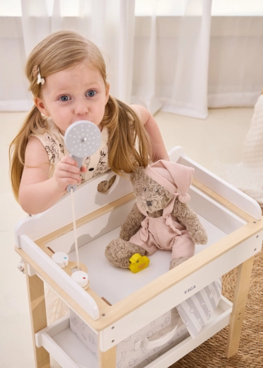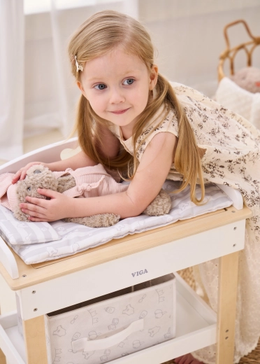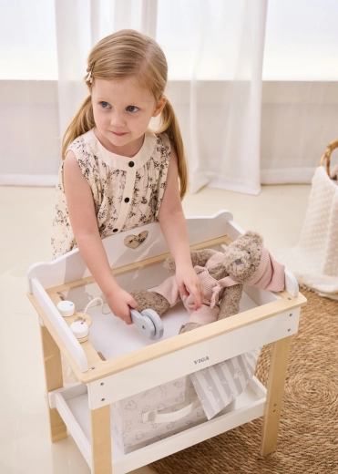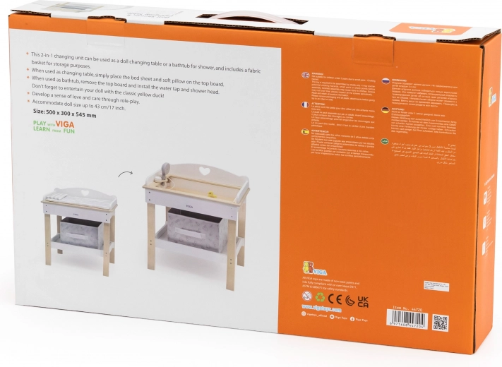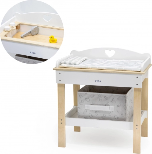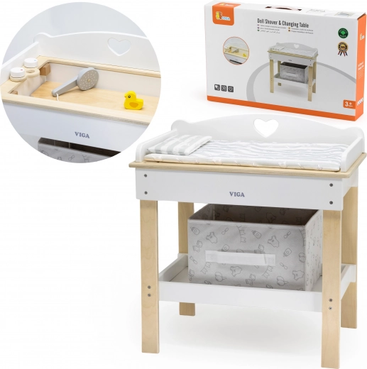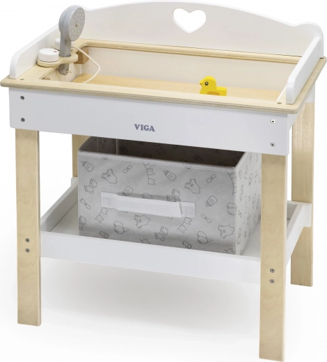 Ez a multifunkciós készlet a VIGA márkától lehetővé teszi a gyerekek számára, hogy valósághűen játsszák el a babagondozást. A felső lap kényelmes pelenkázó felületként szolgál; a lap eltávolítása után zuhanyfejes babakáddá alakul a vízi rituálékhoz. Az alsó polc textilkosárral mindent rendezetten és kéznél tart.