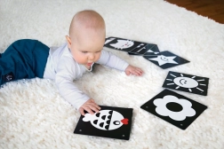 Az egyszerű fekete-fehér illusztrációk erőteljes formákkal segítik a részletek észlelését, és természetesen felkeltik az újszülöttek figyelmét.