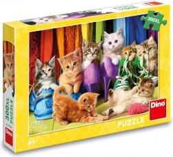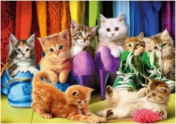 Vidám kép kiscicákról cipők és gombolyagok között, amely motiválja a gyerekeket a kirakásra, és kész állapotban díszíti a gyerekszobát.