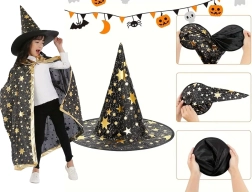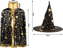 Ragyogtasd fel a Halloweent és a farsangot ezzel a stílusos gyerek boszorkány/varázsló jelmezzel. A szett fekete köpenyből áll arany csillagokkal és egy klasszikus, hegyes kalapból. A könnyű anyagnak és az univerzális méretnek köszönhetően könnyen felvehető, kényelmes, és nem korlátozza a mozgást – tökéletes minden varázslatos játékhoz és jelmezes mulatsághoz.