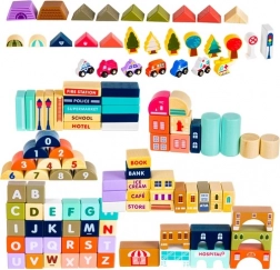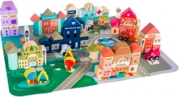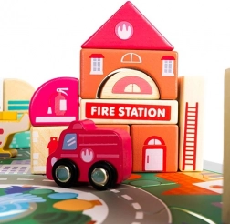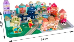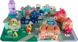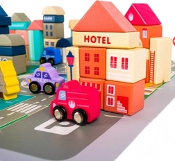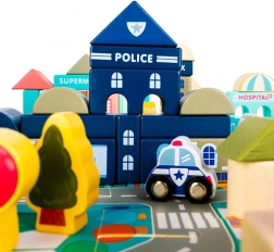 A gazdag felszereltség olyan épületeket tartalmaz, mint a iskola, kórház, tűzoltóállomás, rendőrség, bank, könyvesbolt, szupermarket, múzeum és kávézó, valamint 7 járművet (rendőrség, tűzoltóság, mentő, taxi, iskolabusz, autó, helikopter). A faelemek gondosan csiszoltak, az élek lekerekítettek, a festékek nem mérgezőek – ideális a biztonságos gyerekjátékhoz.