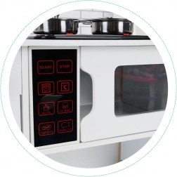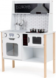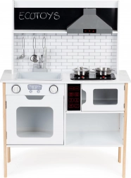 Stílusos fa gyerekkonyha 3 éves kortól, amely valósághű szórakozást nyújt a LED-del megvilágított főzőlapoknak, a főzés hangjainak és a forgatható, „kattanó” gomboknak köszönhetően. Nem hiányzik az nyitható sütő és mikrohullámú sütő, a mozgatható csaptelep és a rendszert segítő tároló szekrények sem. A kiváló minőségű, stabil felépítésű ECOTOYS márka fejleszti a fantáziát és a finommotorikát.