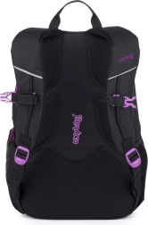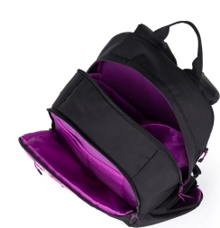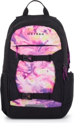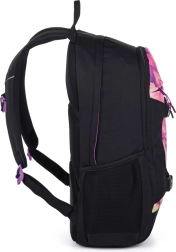 A fekete alapot rózsaszín–lila márványos minta és markáns részletek egészítik ki. A hátizsák illik iskolába, munkába és szabadidős használatra is.