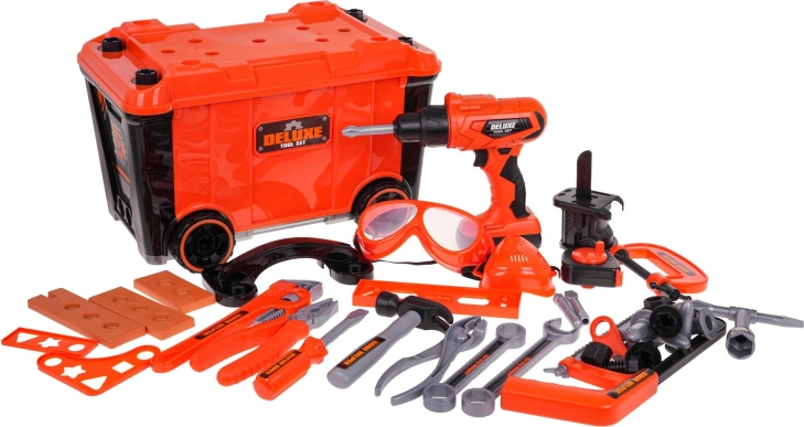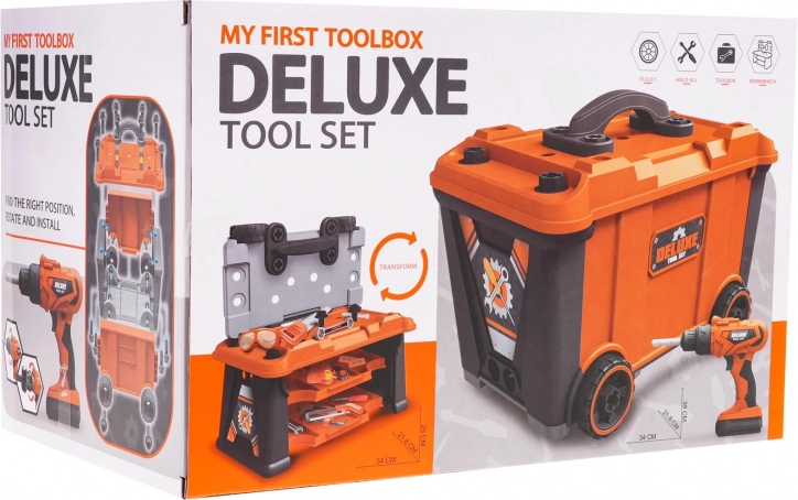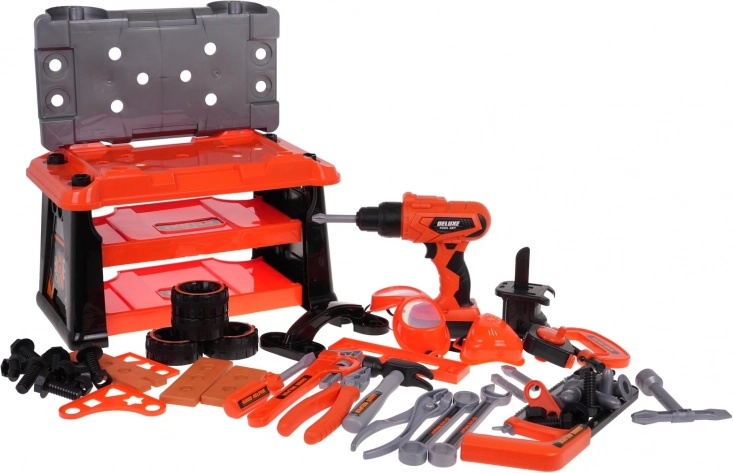 Jól felszerelt 2 az 1-ben szerszámkészlet kis barkácsolóknak 3 éves kortól. A készletből munkapadot építhetsz, majd játék után átalakíthatod a készlethez tartozó szerszámos bőrönddé. A szett 65 elemet tartalmaz, többek között műhelyelemeket, szerszámokat, fűrészt, csavarhúzókat, elemes fúrógépet/csavarozót, sok csavart stb. A csavarozó 2 x 1,5 V AA elemmel működik, az elemek nem részei a csomagnak. A csavarozó úgy működik, mint az igazi: csavar be- és kicsavarás, levehető akkumulátorral, 3 cserélhető bittel és fűrészfejjel.