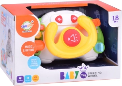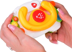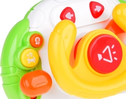 A kormányt úgy tervezték, hogy könnyedén elférjen a babakocsiban vagy az utazótáskában. Az intuitív gomboknak köszönhetően a gyerekek gyorsan elsajátítják a kezelést: piros gomb a dudához, sárga a dallamokhoz (3 féle) és kék a hangokhoz és zenéhez (4 féle). Zenelejátszás közben a kormány közepe ritmusra felvillan.