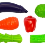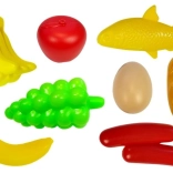 A készlet különféle műanyag élelmiszereket tartalmaz, amelyek bemutatják az egészséges étkezési szokásokat.