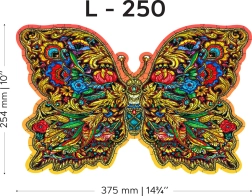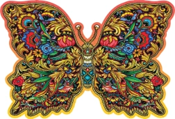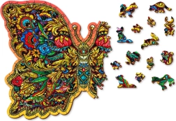 A gazdag mintákkal és feltűnő színekkel ábrázolt pillangó dekoratív képpé teszi a kész puzzle-t, amely bármely enteriőrben kiemelkedik.