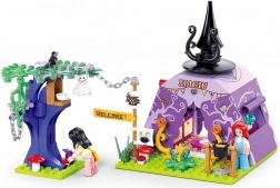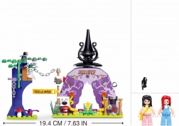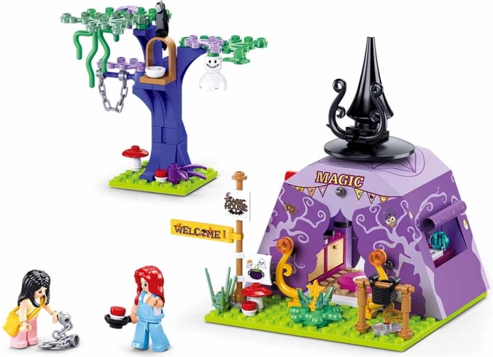 Az építőkészlet tartalmaz egy varázslatos sátrat elbűvölő lila színben "MAGIC" felirattal, ideális játék és képzelőerő számára.