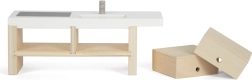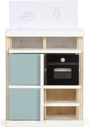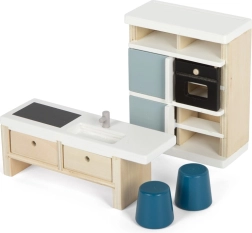 Ez a szépen megtervezett konyhai készlet babaházhoz valósághű játékélményt nyújt. Magas konyhaszekrényből, mosogatós és főzőlappal ellátott szigetből, valamint két paddal és puffokkal ellátott étkezőasztalból áll. A konyhaszekrény kombinált hűtő-fagyasztóval és nyitható sütővel van felszerelve.