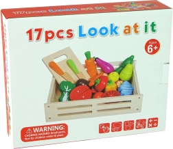 - A csomag tartalma: fa tálca, fa kés, zöldségek (káposzta, uborka, paradicsom, burgonya, hagyma) és gyümölcsök (körte, narancs, kivi, citrom).
