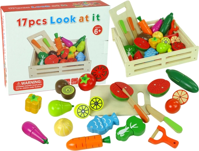 Szórakoztató és biztonságos fából készült gyümölcs- és zöldségszeletelő készlet kis szakácsoknak. A tépőzáras összekapcsolásnak köszönhetően az ételek könnyen „szeletelhetők” és újra összerakhatók, ami fejleszti a finommotorikát, a kéz–szem koordinációt és a kreatív főzőcskézést. Ideális kiegészítő a gyerekkonyhába, tartós fából készült, 3 éves kortól, megfelel az EN 71 szabványnak.