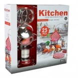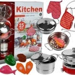 A Kis Szakács szett mindent tartalmaz, amire egy kis szakácsnak szüksége lehet. Fémes megjelenésével a fazekak és konyhai eszközök remekül mutatnak minden gyermek konyhában.