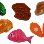 A szett tartalmaz színes műanyag élelmiszereket, amelyek ösztönzik a képzeletbeli játékot és az ételről való tanulást.