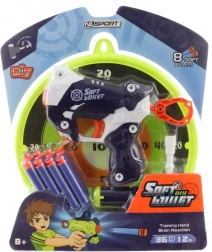 A csomagban pisztoly, céltábla, 8 db hablövedék és csavarhúzó található – minden az azonnali szórakozáshoz.