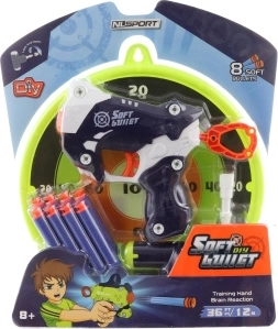 A szett része egy pontozott céltábla, amely motivál a jobb eredmények elérésére. A nyolc puha, tapadókorongos lövedék könnyen rátapad a sima felületekre, így a játék biztonságos és tiszta. A praktikus csavarhúzó a kis barkácsolóknak is kedvez – a csavarozható elemek fejlesztik a finommotorikát és az ügyességet.
