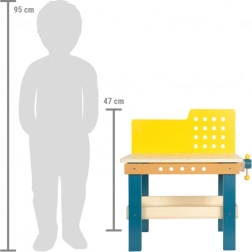 Kompakt, tömör fából készült gyerek munkapad satuval, tárolóhellyel és gazdag szerszámkészlettel. Fejleszti a finommotorikát, a kéz–szem koordinációt és a kreatív játékot. Tartozék a kalapács, csavarhúzó, villáskulcs, fűrész, csavarok, anyák, fogaskerekek és perforált lapok – beleértve az útmutatót egy kis versenyautó megépítéséhez.
