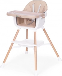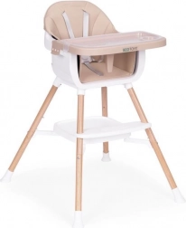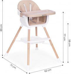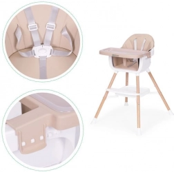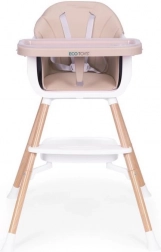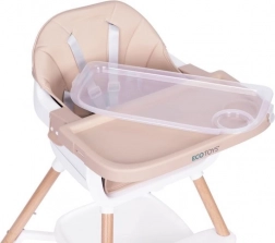 A praktikus, 2 az 1-ben ECOTOYS gyerek etetőszék 6–36 hónapos korig együtt nő gyermekével. Magas stabilitást biztosít a fém lábaknak köszönhetően, könnyen tisztítható a ökobőr kárpit és a levehető, két rétegű tálca révén, amely mosogatógépben mosható. A biztonságról 5 pontos öv és csúszásgátló ütköző gondoskodik, a kényelmet lábtartó és az ülés alatti tárolópolc egészíti ki. Használható magas etetőszékként és székfeltétként is – utazáshoz is ideális.