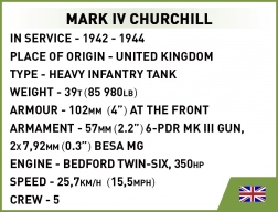 Építse meg a legendás brit nehéz gyalogsági harckocsit, a MARK IV CHURCHILL modellt 1:35 méretarányban, 668 minőségi COBI elemből. A modell működő lánctalppal, forgatható toronnyal, mozgatható löveggel és nyitható búvónyílással rendelkezik. A készlet része 2 részletgazdag figura bőséges kiegészítőkkel és magas minőségű, nem fakuló nyomatokkal. Ideális történelemrajongóknak és építőknek egyaránt.